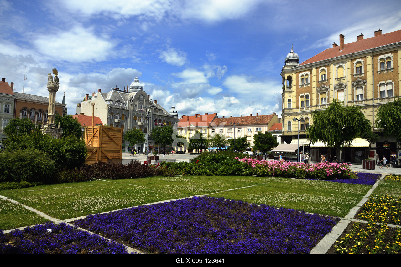 A barokk Fő tér. Balra a Szentháromság-szobor, középen hátul a szecessziós stílusú Centrum Áruház épülete, jobbra az eklektikus stílusban, sarokerkéllyel épült bérpalota.