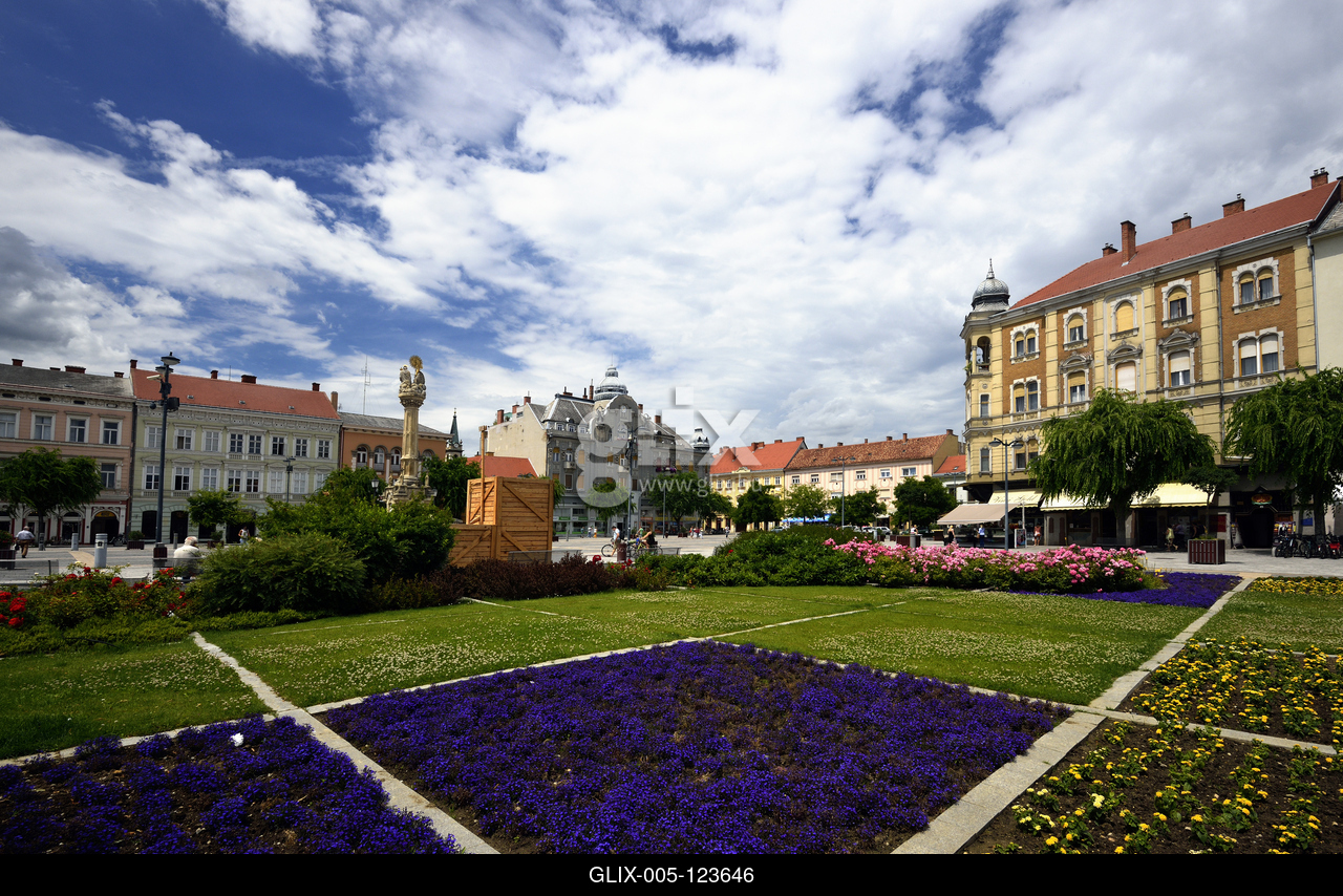 A barokk Fő tér. Középen a Szentháromság-szobor, háttérben a szecessziós stílusú Centrum Áruház épülete, jobbra az eklektikus stílusban, sarokerkéllyel épült bérpalota.