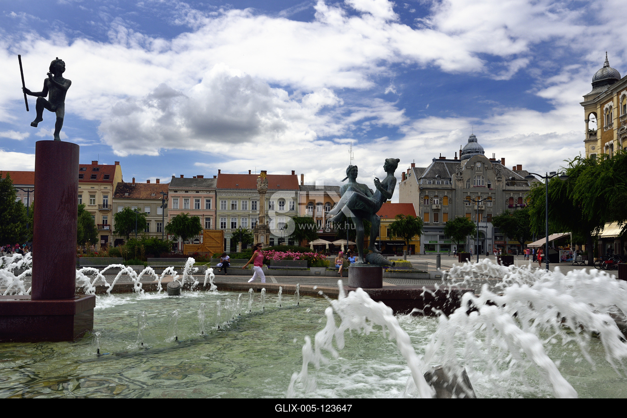 A város szökőkútja a Faunok szoborcsoporttal a barokk Fő téren.