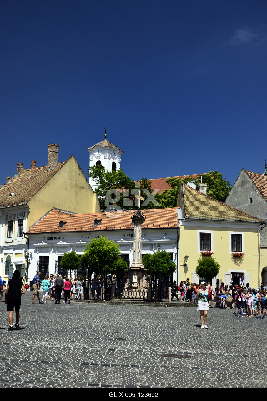 A műemlék barokk, illetve copf stílusú házakkal szegélyezett Fő tér. Középen a késő rokokó stílusú Kalmár-kereszt. Háttérben a vártemplom tornya.