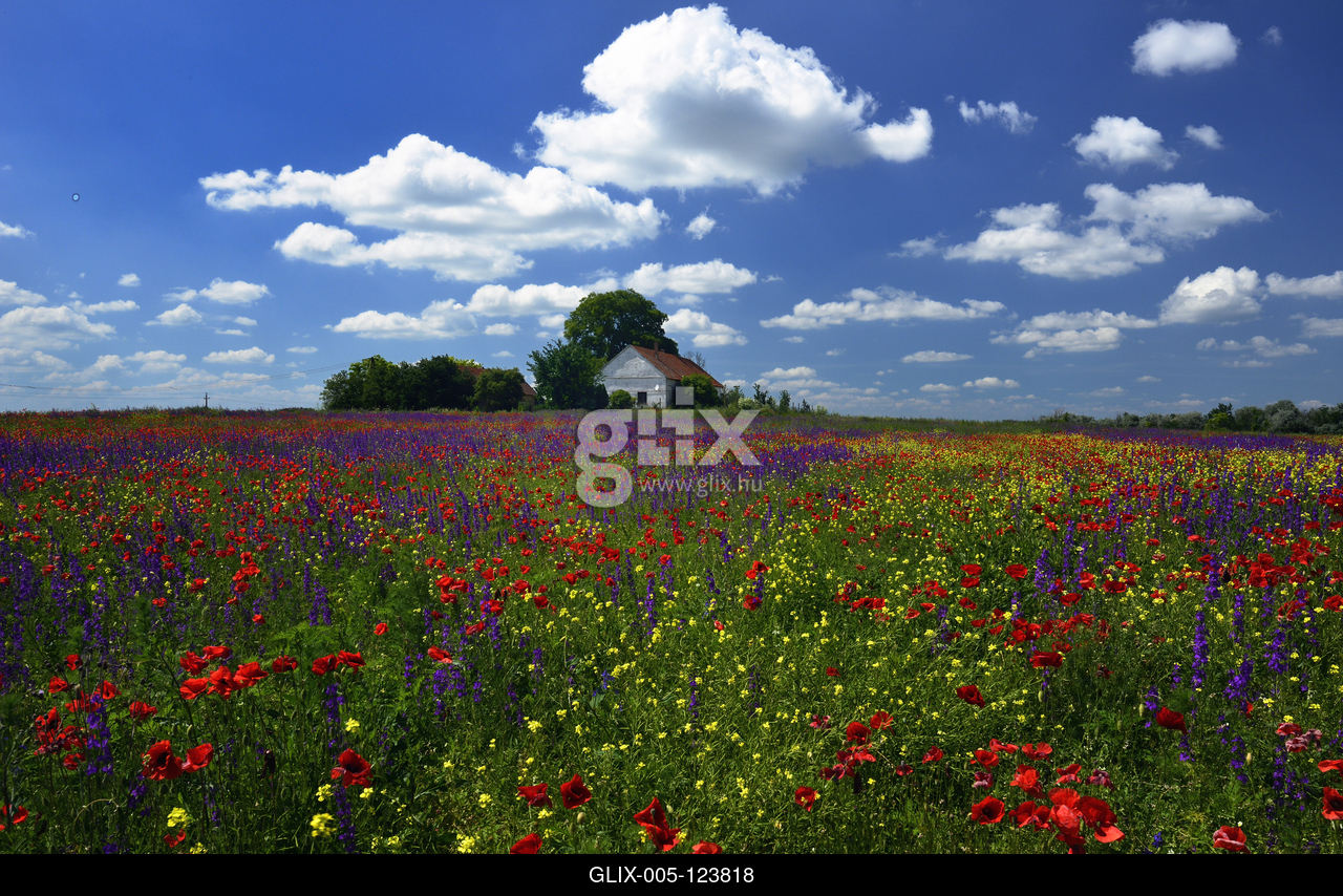 Vadvirágos mező és egy tanya az Alföldön, Szatymaz határában.