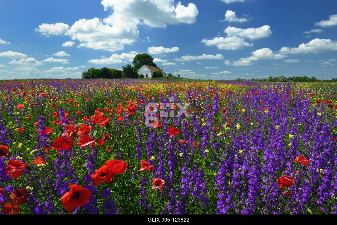 Vadvirágos mező és egy tanya az Alföldön, Szatymaz határában.