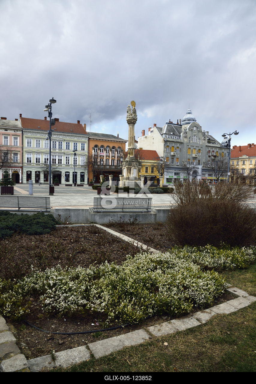 A Szentháromság-szobor a barokk Fő tér közepén. Háttérben a szecessziós stílusú Centrum Áruház épülete.