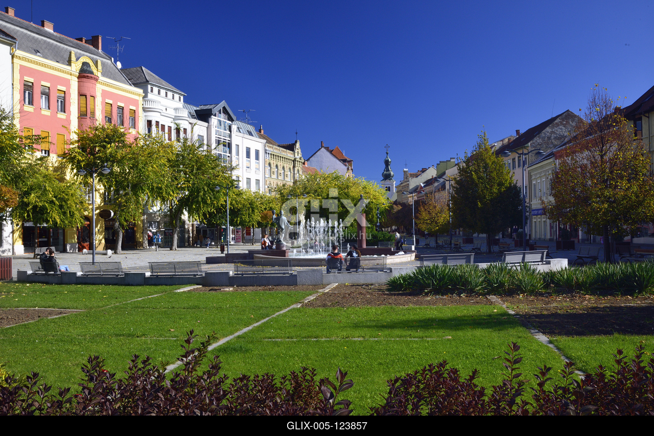 A város szökőkútja a Faunok szoborcsoporttal a barokk Fő téren.