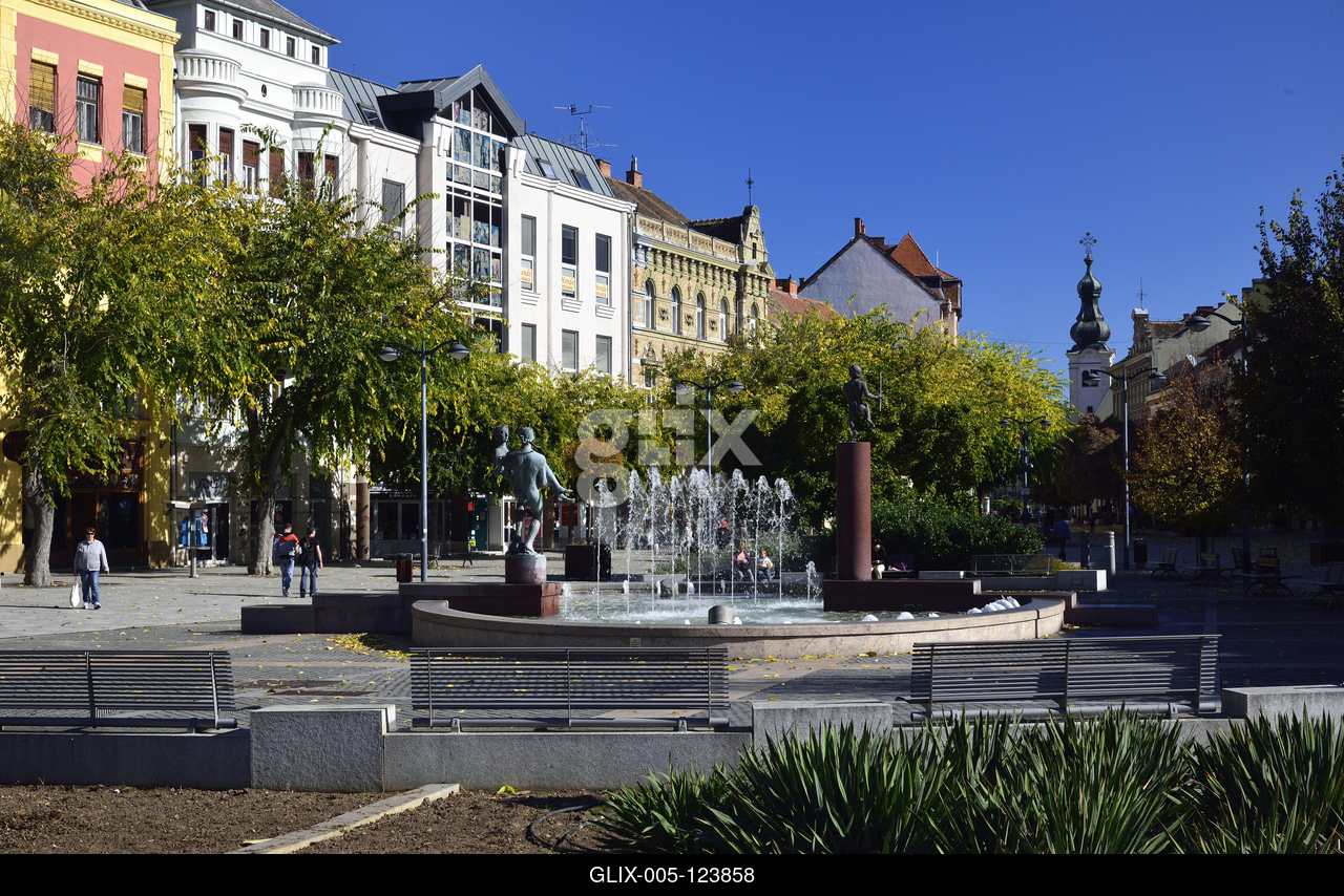 A város szökőkútja a Faunok szoborcsoporttal a barokk Fő téren.