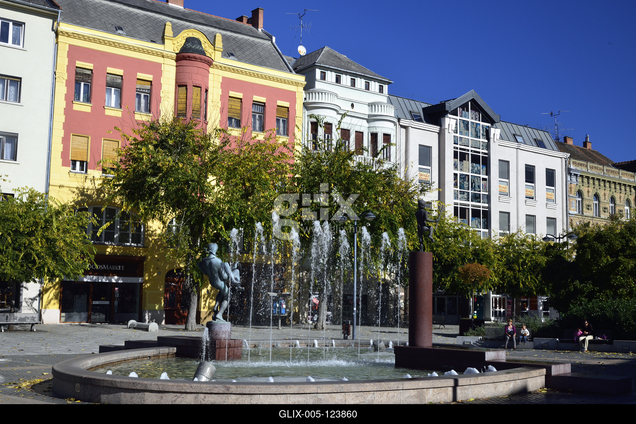 A város szökőkútja a Faunok szoborcsoporttal a barokk Fő téren.
