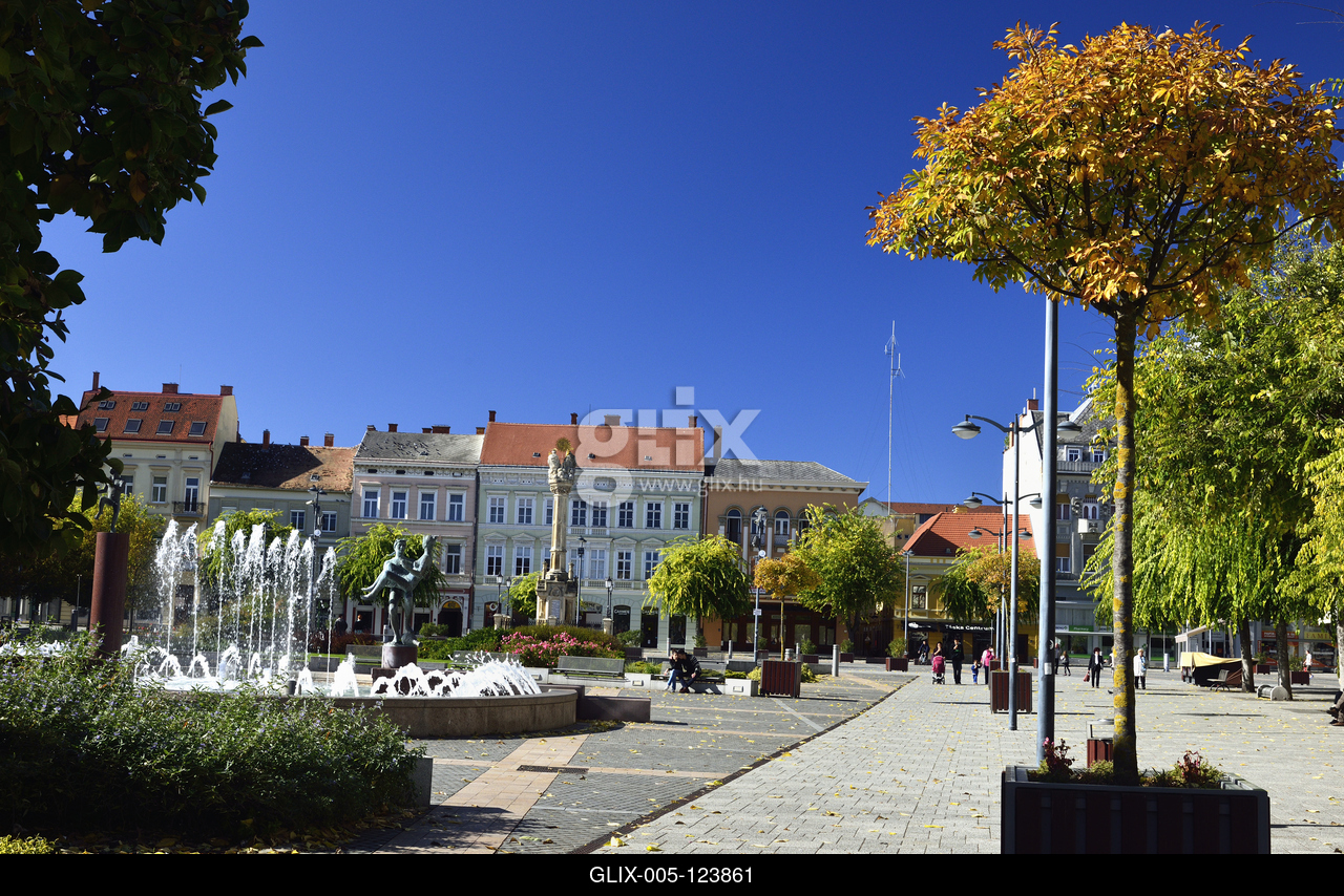 A város szökőkútja a Faunok szoborcsoporttal a barokk Fő téren. Középen a Szentháromság-szobor.