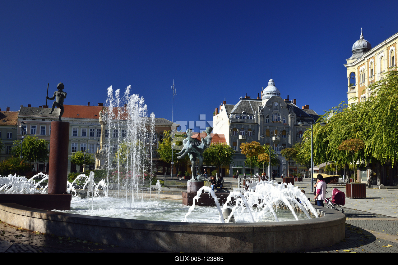 A város szökőkútja a Faunok szoborcsoporttal a barokk Fő téren. Háttérben a szecessziós stílusú Centrum Áruház épülete.
