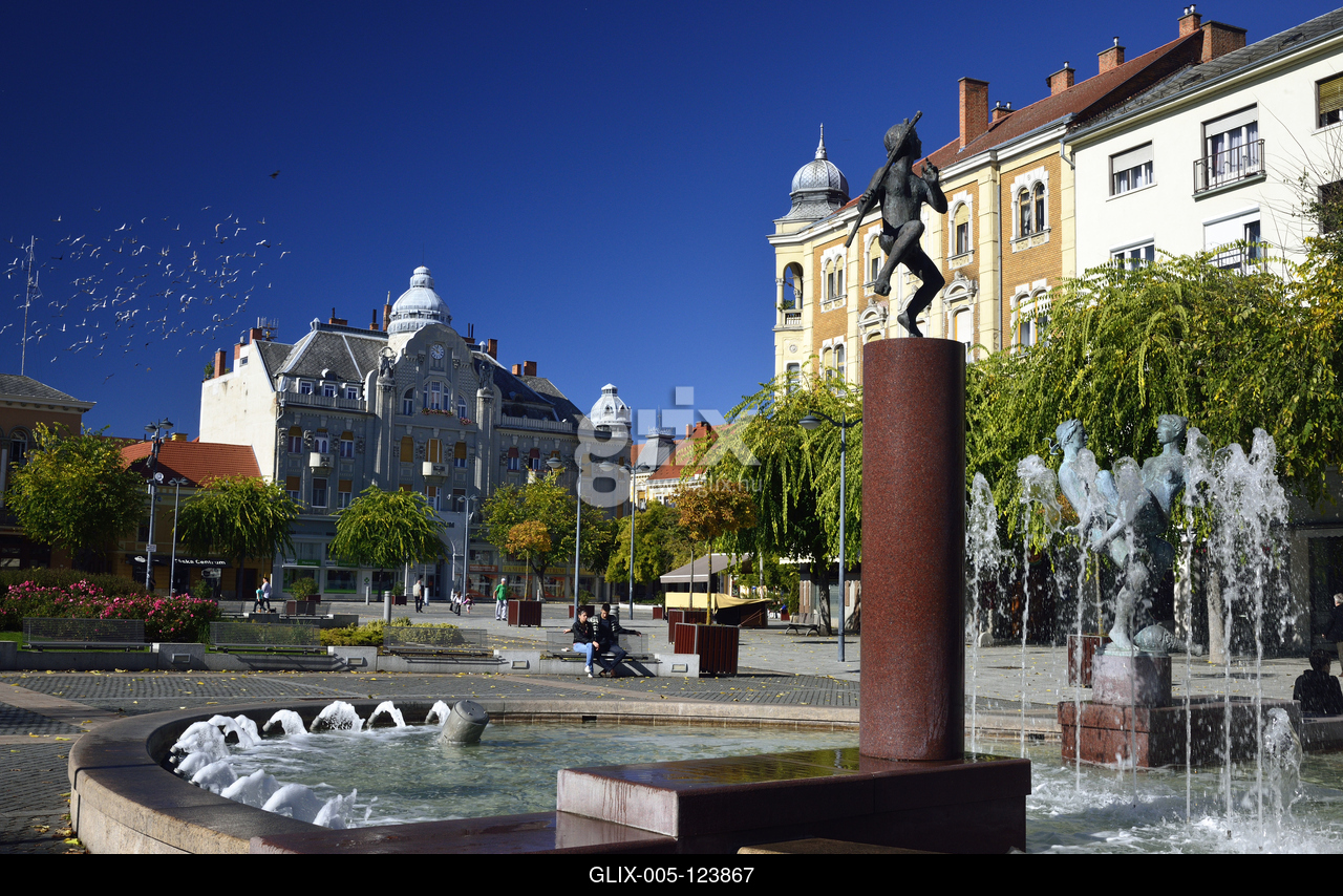 A város szökőkútja a Faunok szoborcsoporttal a barokk Fő téren. Háttérben a szecessziós stílusú Centrum Áruház épülete és az eklektikus stílusban, sarokerkéllyel épült bérpalota.