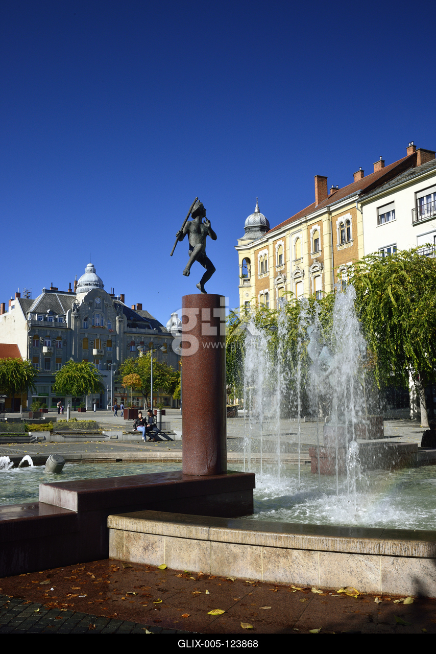 A város szökőkútja a Faunok szoborcsoporttal a barokk Fő téren. Háttérben a szecessziós stílusú Centrum Áruház épülete és az eklektikus stílusban, sarokerkéllyel épült bérpalota.