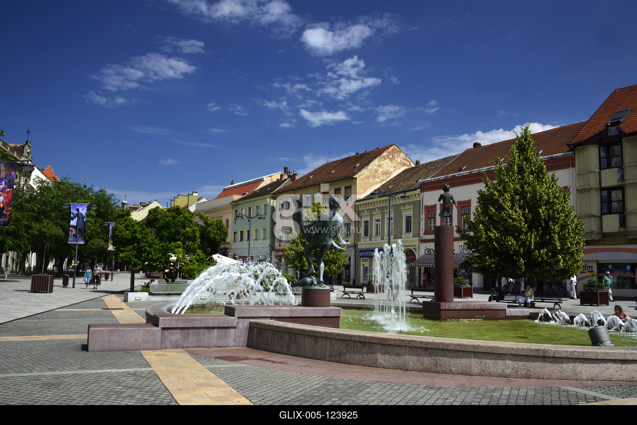A város szökőkútja a Faunok szoborcsoporttal a barokk Fő téren.