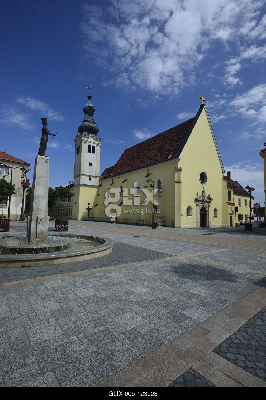 A gótikus Árpádházi Szent Erzsébet Ferences templom. Előtérben a Savaria-kút és Tyche istennő szobra.