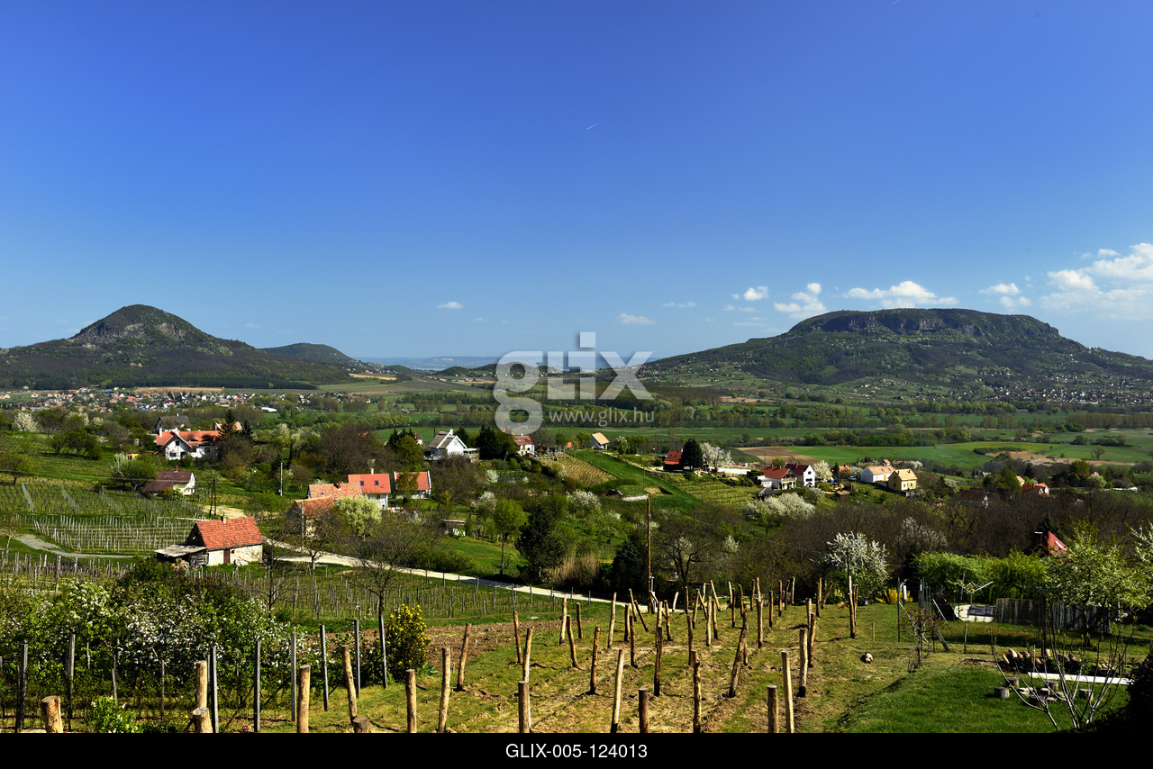 A Balaton-felvidék tanúhegyei a Szent György hegyről. Jobbra a Badacsony, balra a Gulács, mögötte Ábrahámhegy.