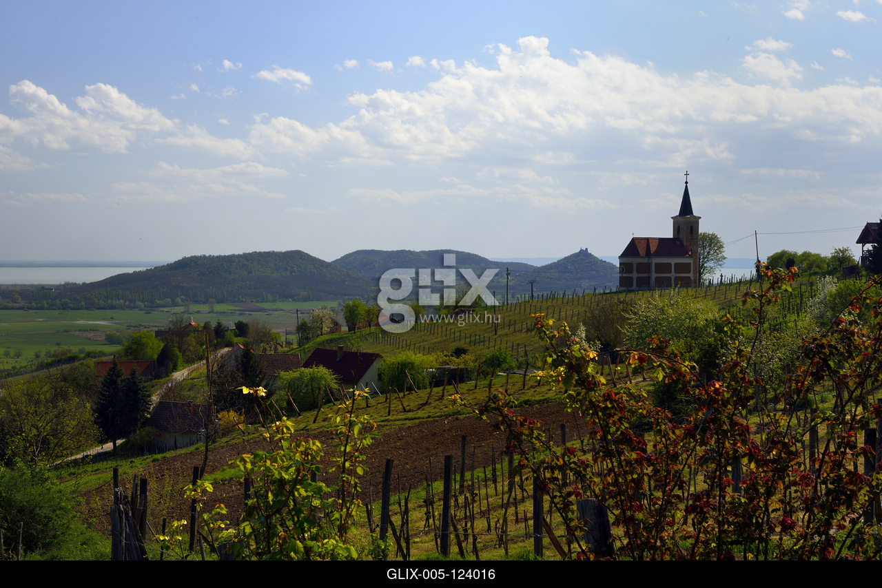 A Lengyel-kápolna a Szent György hegyren. Háttérben balról: Balaton, Antal-hegy, Külsőhegy és a Szigligeti vár.