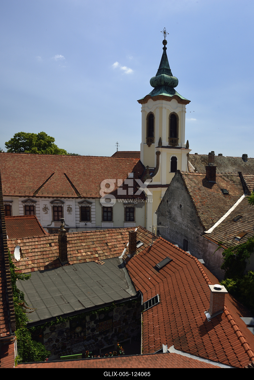 Szentendrei háztetők. Háttérben a barokk, rokokó Blagovesztenszka szerb görögkeleti templom tornya.