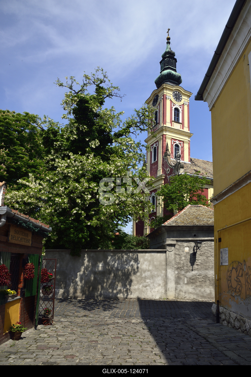 Belvárosi utcarészlet. Háttérben a Belgrád székesegyház.