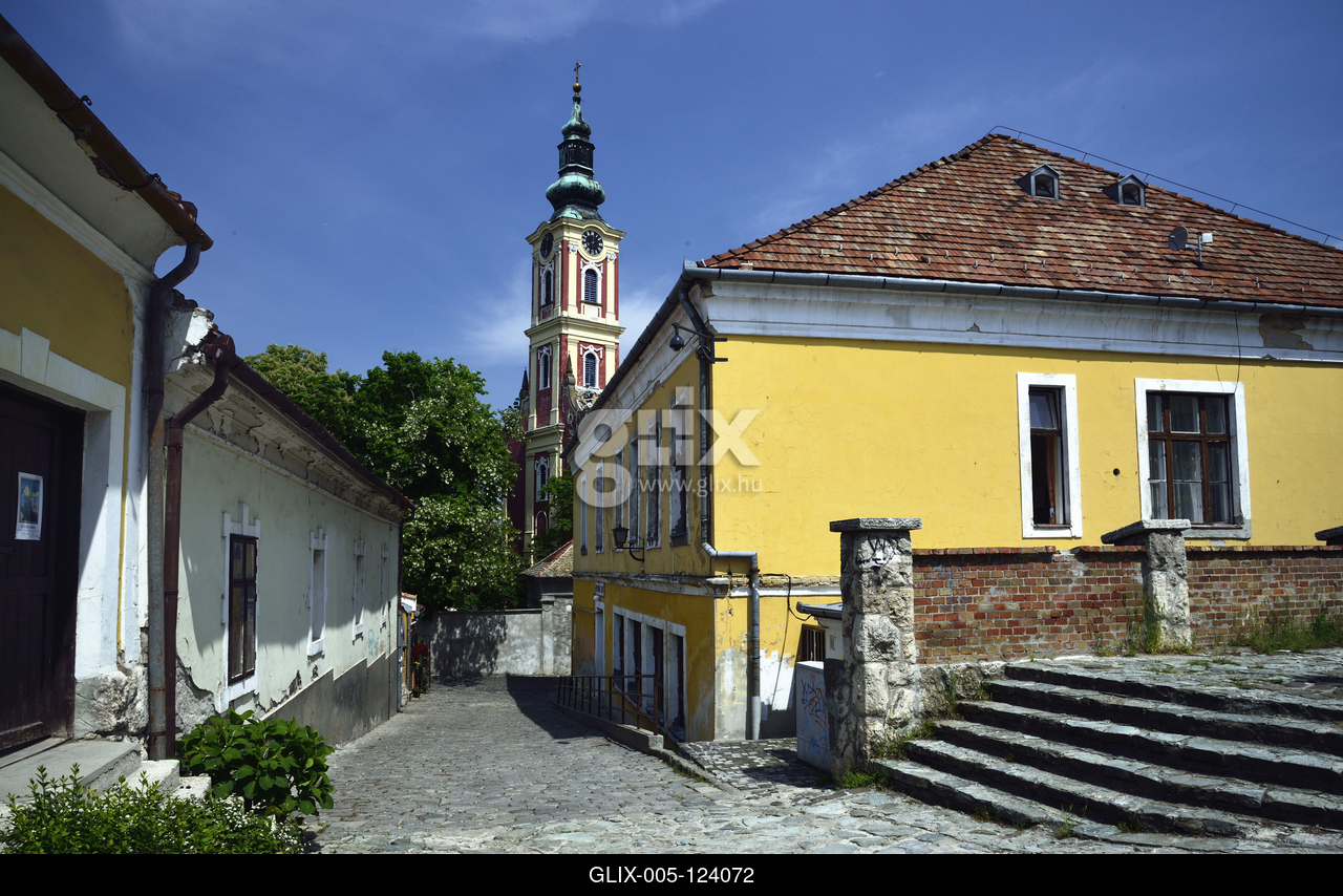 Belvárosi utcarészlet. Háttérben a Belgrád székesegyház.