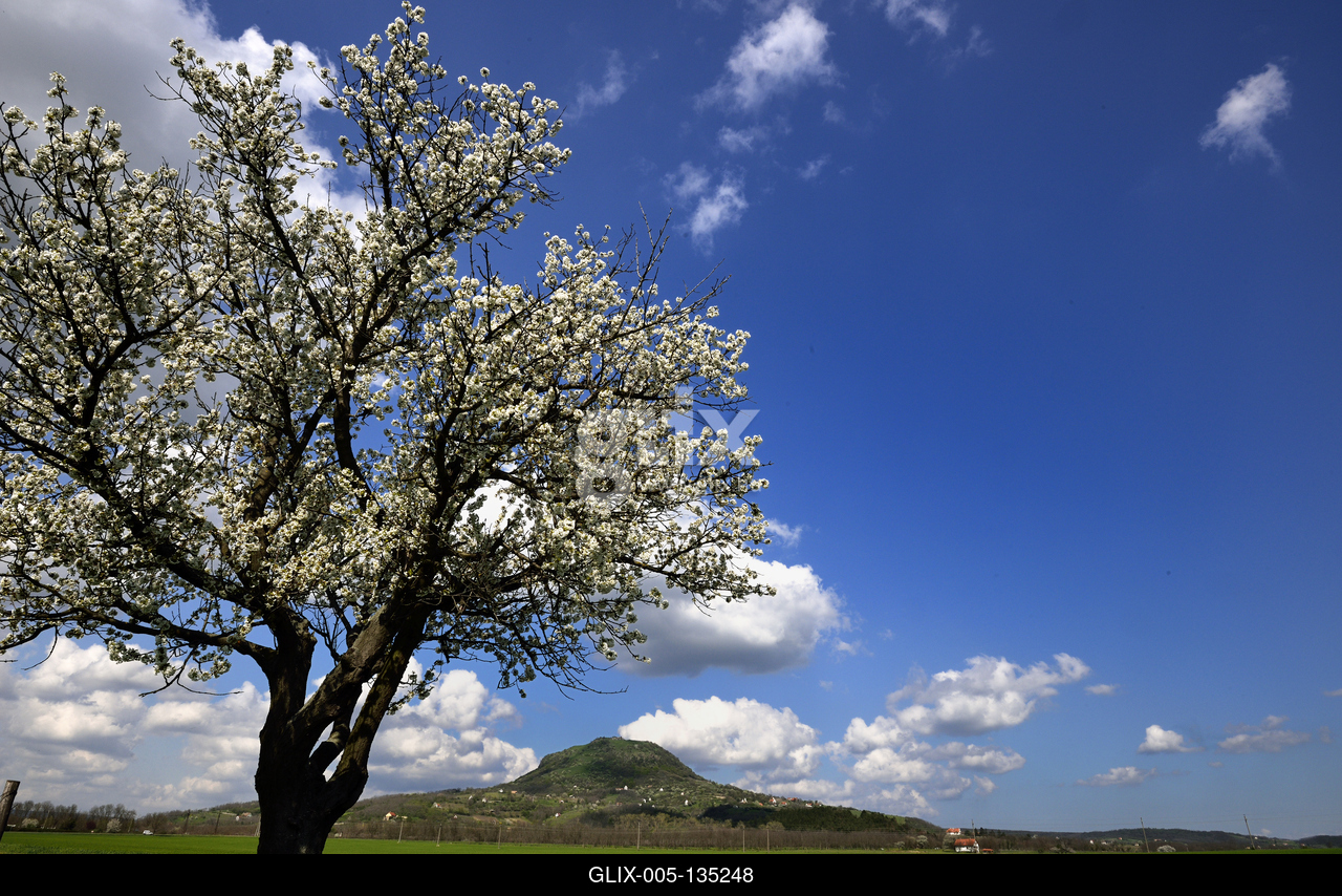 Balatonfelvidéki táj , Balaton-felvidéki táj a Tapolcai-medencében. Háttérben a Csobánc.