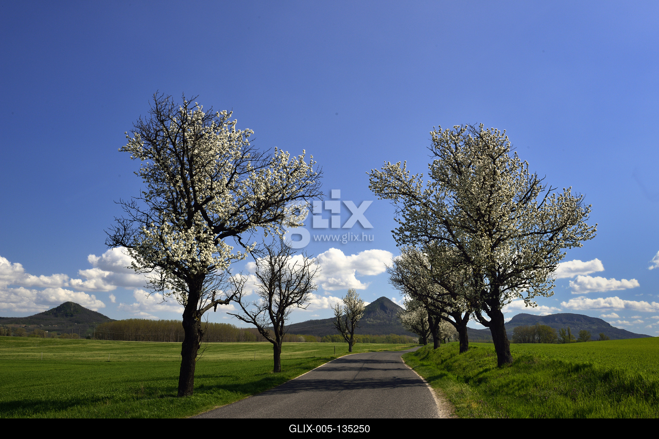 Balaton-felvidéki táj a Tapolcai-medencében. Háttérben a Tóti hegy (balra), a Gulács és a Badacsony (jobbra).