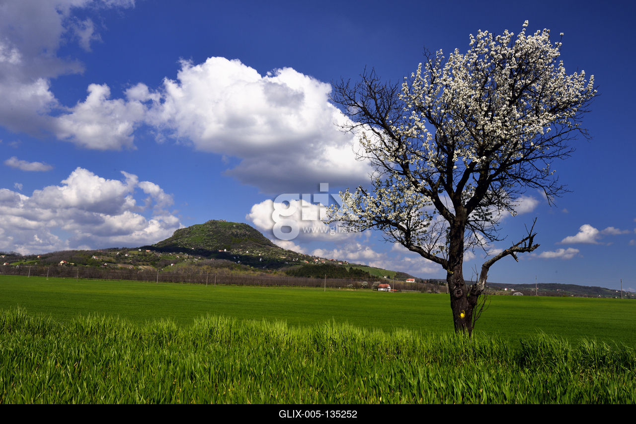 Balatonfelvidéki táj , Balaton-felvidéki táj a Tapolcai-medencében. Háttérben a Csobánc.
