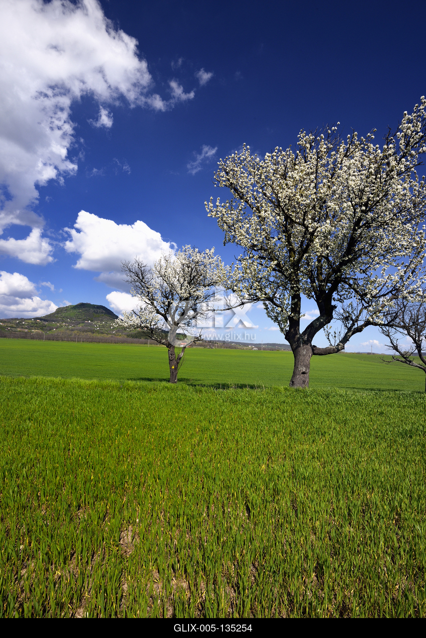 Balatonfelvidéki táj , Balaton-felvidéki táj a Tapolcai-medencében. Háttérben a Csobánc.