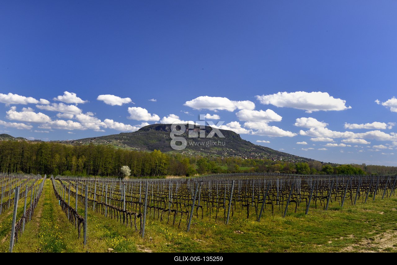 Balaton-felvidéki táj a Tapolcai-medencében. Háttérben a Badacsony.