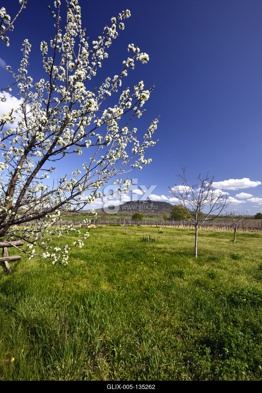 Balaton-felvidéki táj a Tapolcai-medencében. Háttérben a Badacsony.