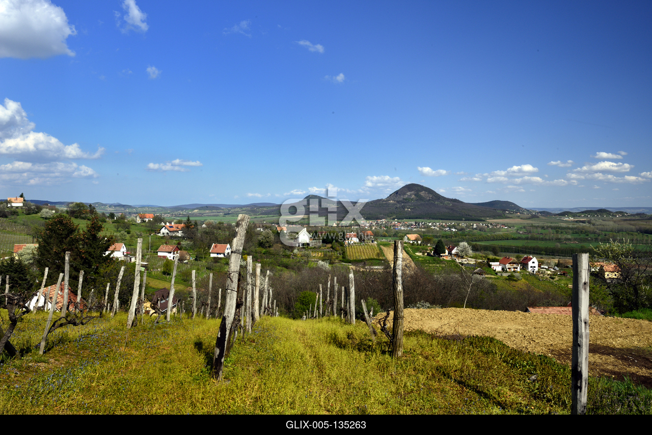 Balaton-felvidéki táj a Tapolcai-medencében. Háttérben a Gulács és a Tóti hegy (balra).