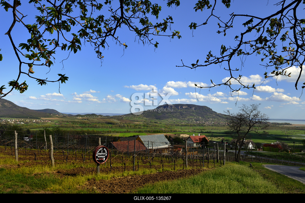 Balaton-felvidéki táj a Tapolcai-medencében. Háttérben a Badacsony.