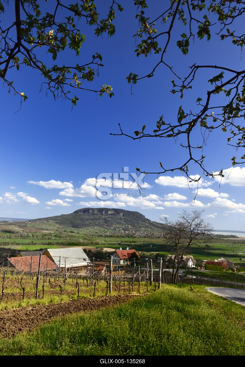 Balaton-felvidéki táj a Tapolcai-medencében. Háttérben a Badacsony.