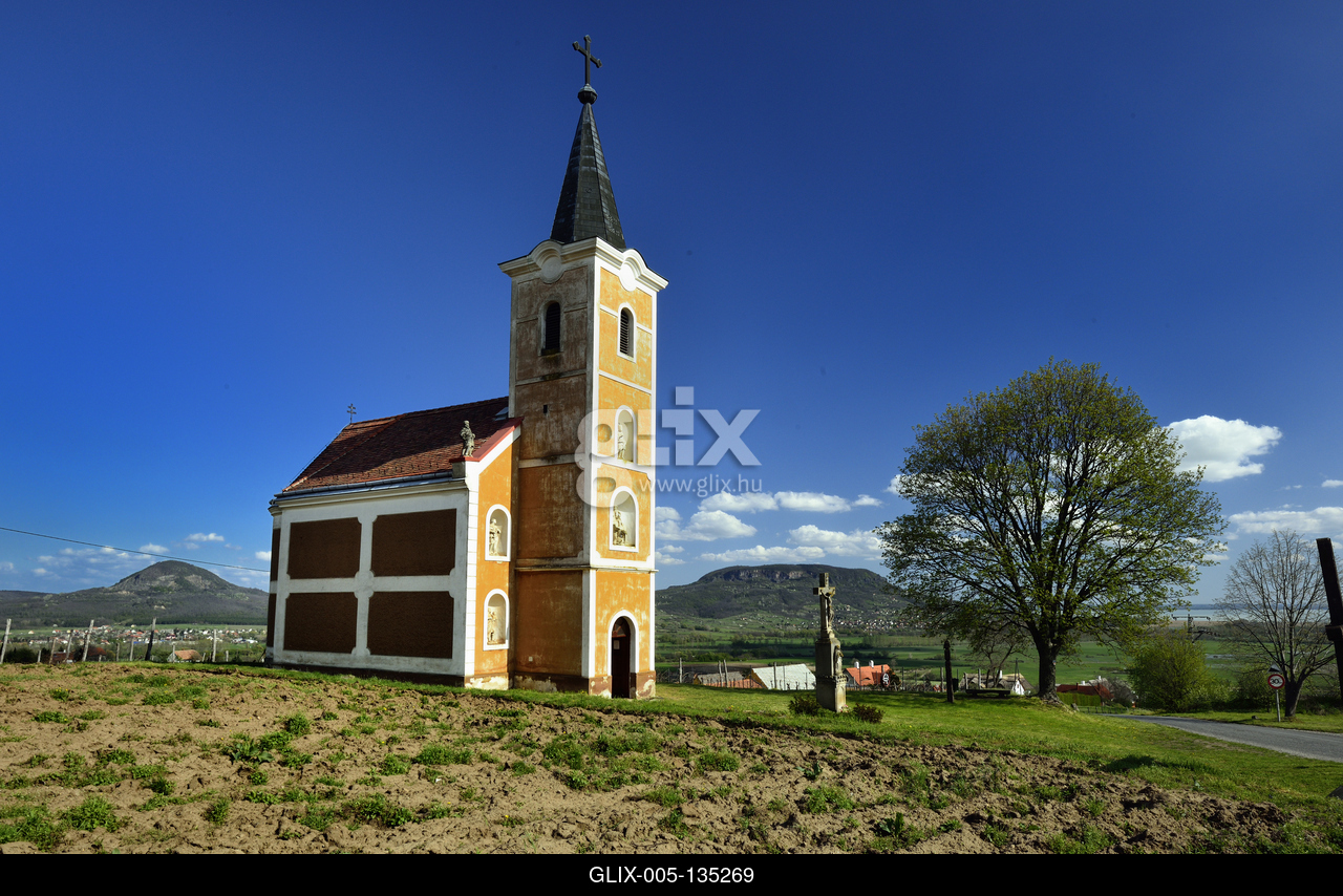 A Lengyel kápolna a Szent György hegyen. Háttérben a Badacsony.