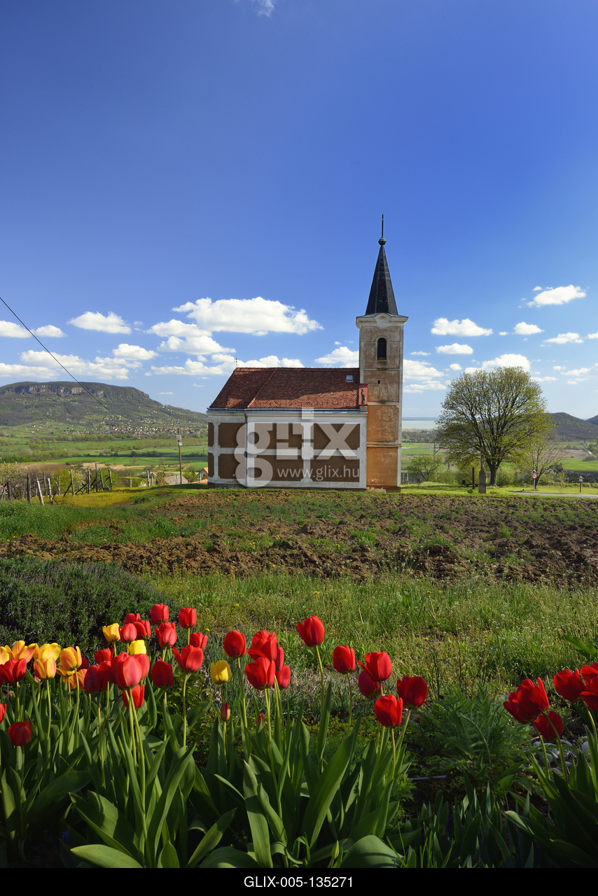 A Lengyel kápolna a Szent György hegyen. Háttérben a Badacsony.