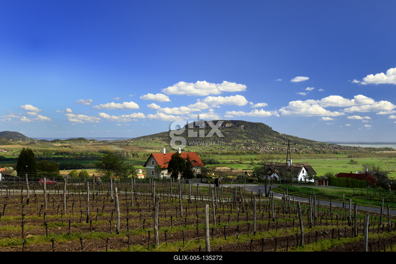 Balaton-felvidéki táj a Tapolcai-medencében. Háttérben a Badacsony.