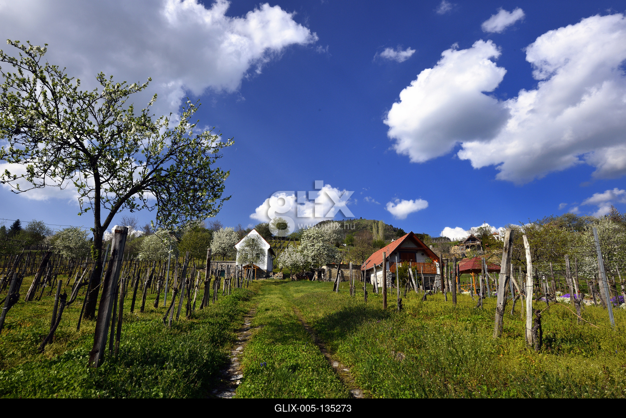 Balaton-felvidéki táj a Tapolcai-medencében. Háttérben a Csobánc.