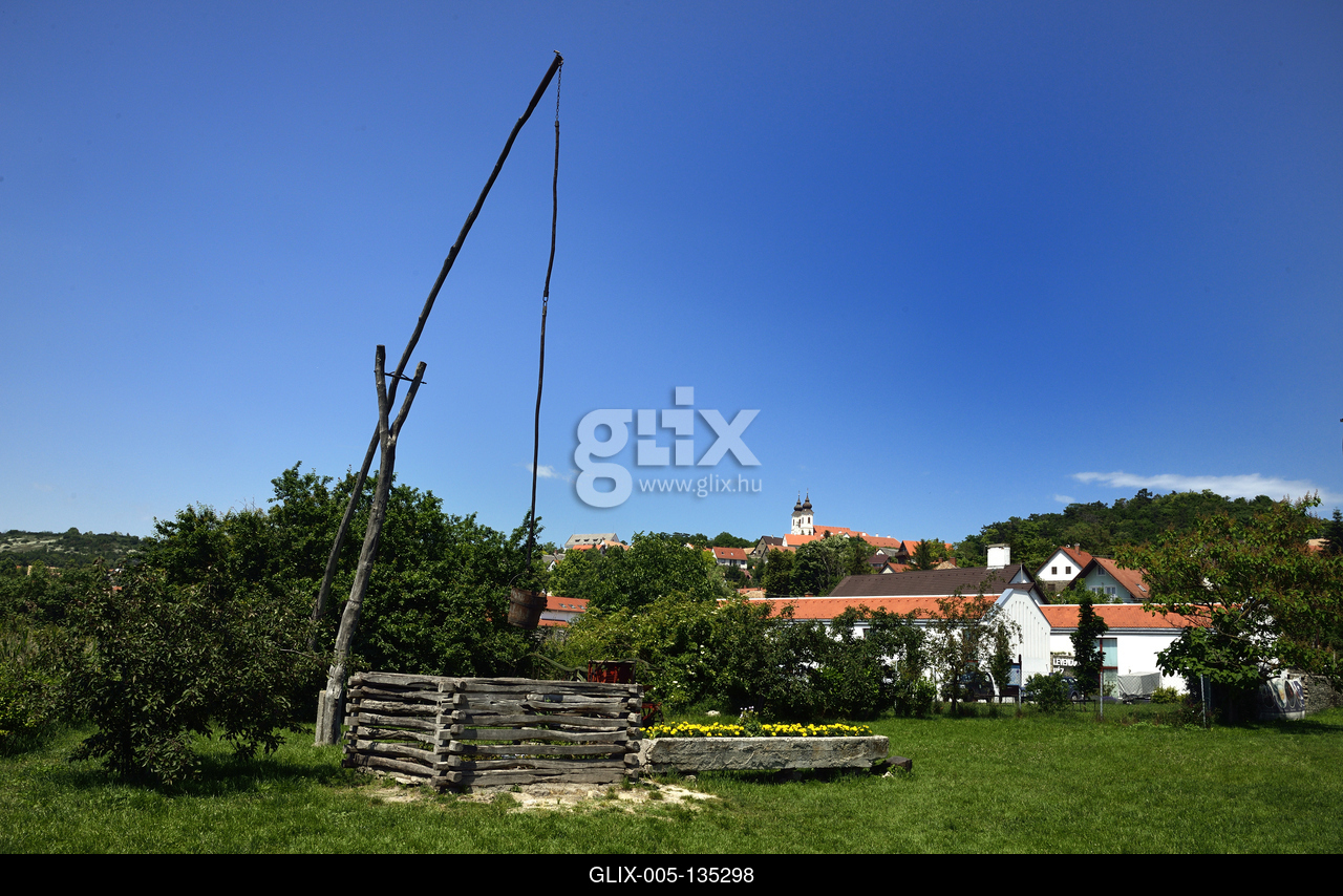Tihanyi látkép a Levendula Ház Látogatóközpont közeléből. Háttérben a Bencés Apátság barokk temploma.