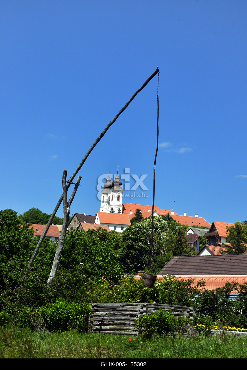 Tihanyi látkép a Levendula Ház Látogatóközpont közeléből. Háttérben a Bencés Apátság barokk temploma.