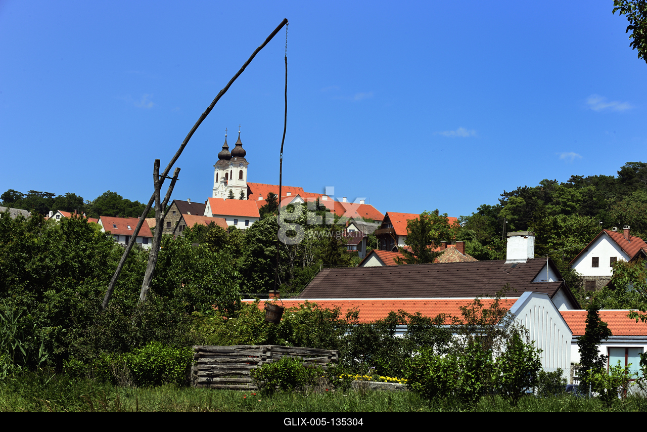 Tihanyi látkép a Levendula Ház Látogatóközpont közeléből. Háttérben a Bencés Apátság barokk temploma.