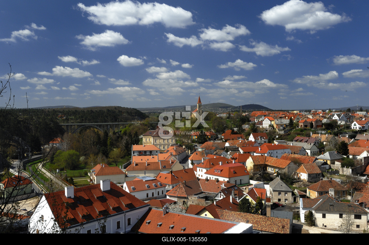 Kilátás a Veszprémi Várból. Háttérben a Szent István Völgyhíd (Viadukt) és mellette a neoromán stílusú, Szent László templom.