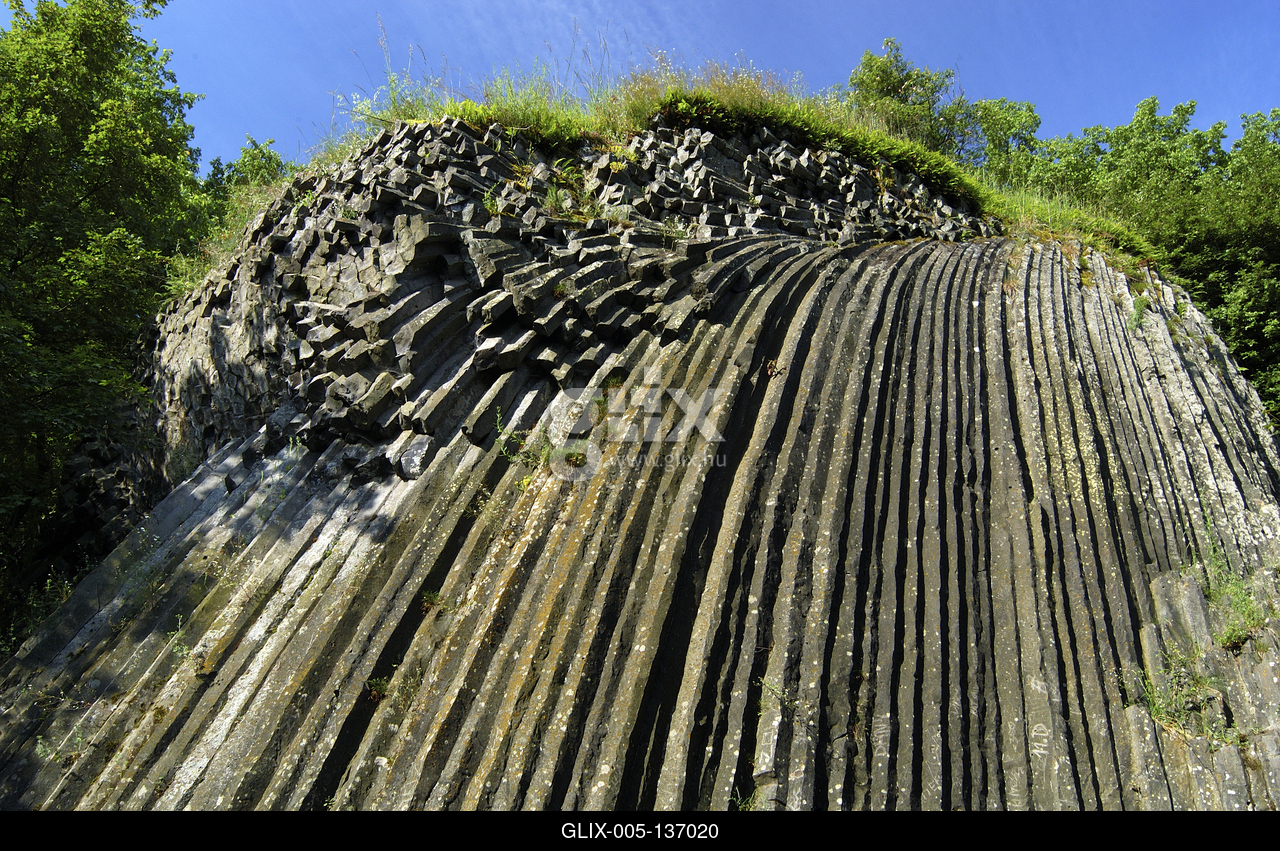 Bazaltorgonák a Somoskői vár északi (szlovákiai) oldalán. A csaknem 500 méter magasságból kihajló, mintegy 16 méter hosszú oszlopok orgonasíp módjára helyezkednek el. A hegy gyomrából kiömlő láva bazalt íves-oszlopos formában szilárdult meg.