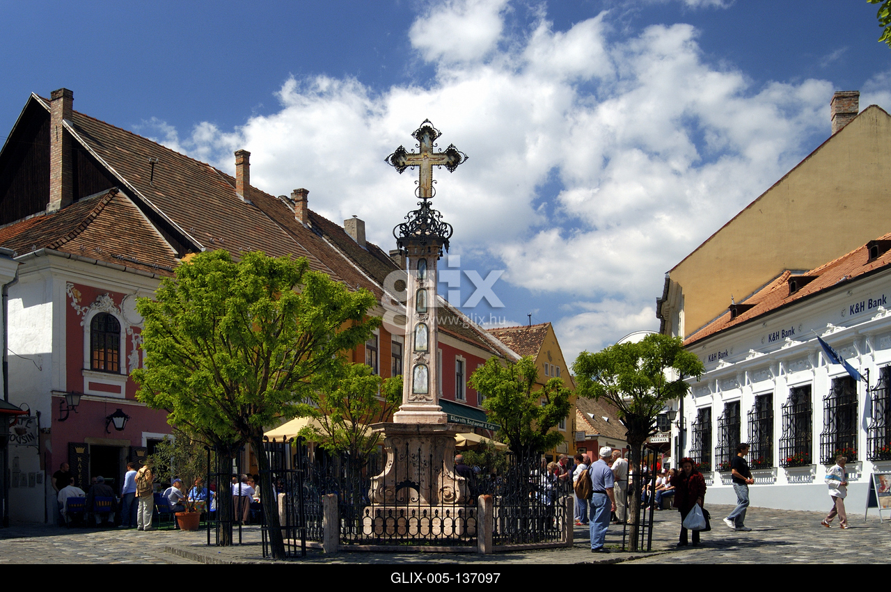 Szentendre, a Fő tér a Kalmár-kereszttel. A színes, mediterrán hangulatú épületekkel körbevett tér közepén egy emlékkeresztet, az úgynevezett Kalmár-kereszt áll, melyet a Szerb Kereskedő Társaság emeltetett 1763-ban, hálából azért, mert a pestisjárvány pusztítása elkerülte a várost.