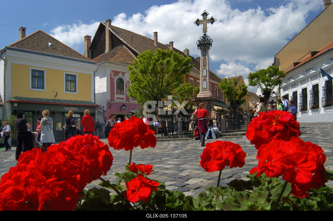 Szentendre, a Fő tér a Kalmár-kereszttel. A színes, mediterrán hangulatú épületekkel körbevett tér közepén egy emlékkeresztet, az úgynevezett Kalmár-kereszt áll, melyet a Szerb Kereskedő Társaság emeltetett 1763-ban, hálából azért, mert a pestisjárvány pusztítása elkerülte a várost.