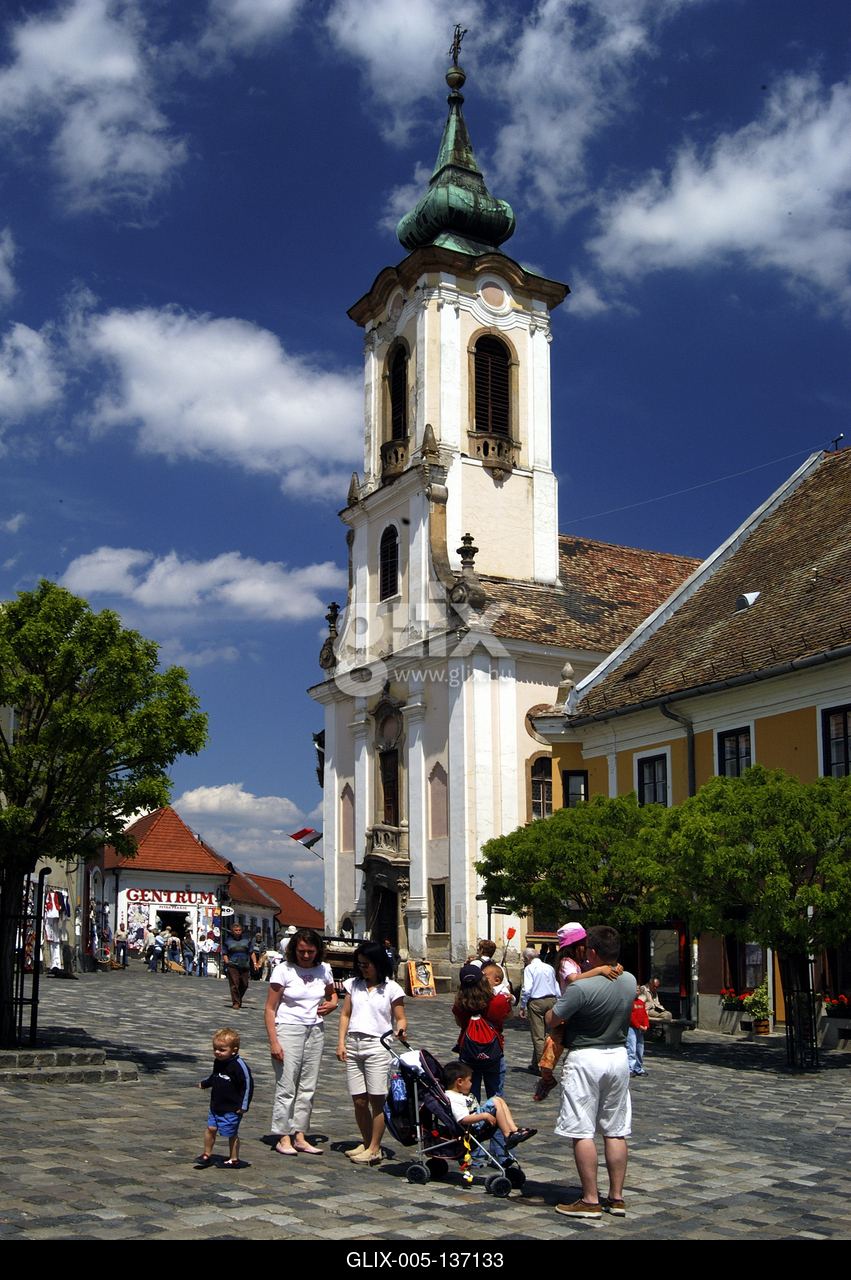 Szentendre, a Gyümölcsoltó Boldogasszony (Blagovesztenszka) templom a Fő téren. Feltételezések szerint az épületet Mayerhoffer András (1690-1771) tervezte. A templomot 1754. október 15-én Dioniszilje Novákovics budai püspök szentelte fel. A templom védőszentje Gyümölcsoltó Boldogasszony. A Fő tér keleti oldalán emelkedő, kelet-nyugat tengelyű templom barokk és rokokó stílusban épült.