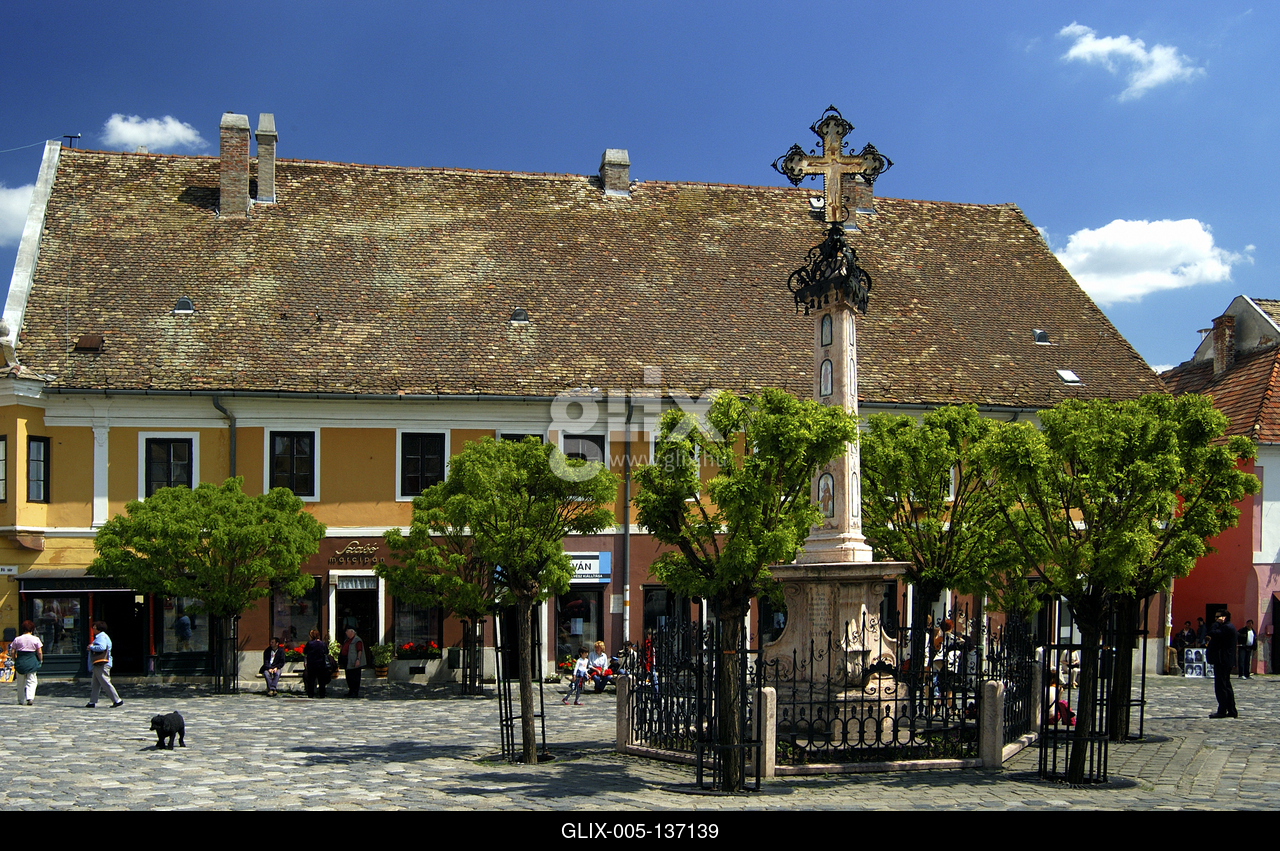 Szentendre, a Fő tér a Kalmár-kereszttel. A színes, mediterrán hangulatú épületekkel körbevett tér közepén egy emlékkeresztet, az úgynevezett Kalmár-kereszt áll, melyet a Szerb Kereskedő Társaság emeltetett 1763-ban, hálából azért, mert a pestisjárvány pusztítása elkerülte a várost.