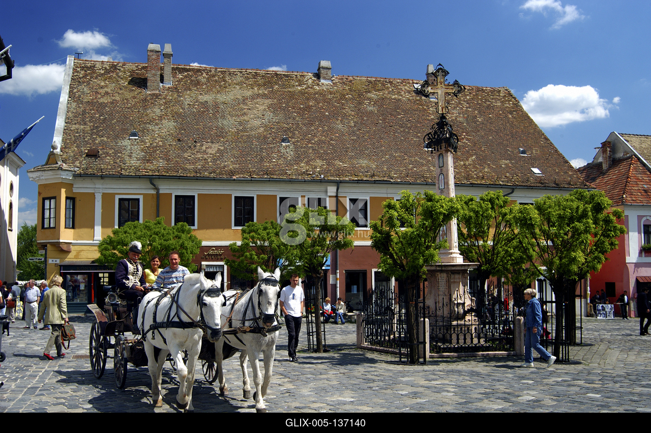 Szentendre, a Fő tér a Kalmár-kereszttel. A színes, mediterrán hangulatú épületekkel körbevett tér közepén egy emlékkeresztet, az úgynevezett Kalmár-kereszt áll, melyet a Szerb Kereskedő Társaság emeltetett 1763-ban, hálából azért, mert a pestisjárvány pusztítása elkerülte a várost.