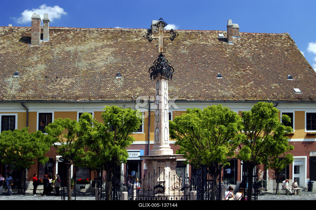 Szentendre, a Fő tér a Kalmár-kereszttel. A színes, mediterrán hangulatú épületekkel körbevett tér közepén egy emlékkeresztet, az úgynevezett Kalmár-kereszt áll, melyet a Szerb Kereskedő Társaság emeltetett 1763-ban, hálából azért, mert a pestisjárvány pusztítása elkerülte a várost.