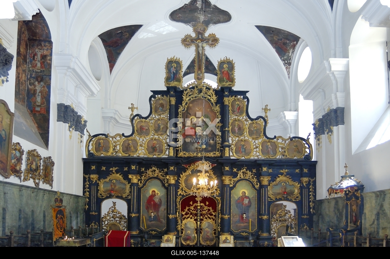 Szentendre, a Gyümölcsoltó Boldogasszony (Blagovesztenszka) templom ikonosztáza. Feltételezések szerint az épületet Mayerhoffer András (1690-1771) tervezte. A templomot 1754. október 15-én Dioniszilje Novákovics budai püspök szentelte fel. A templom védőszentje Gyümölcsoltó Boldogasszony. A Fő tér keleti oldalán emelkedő, kelet-nyugat tengelyű templom barokk és rokokó stílusban épült.