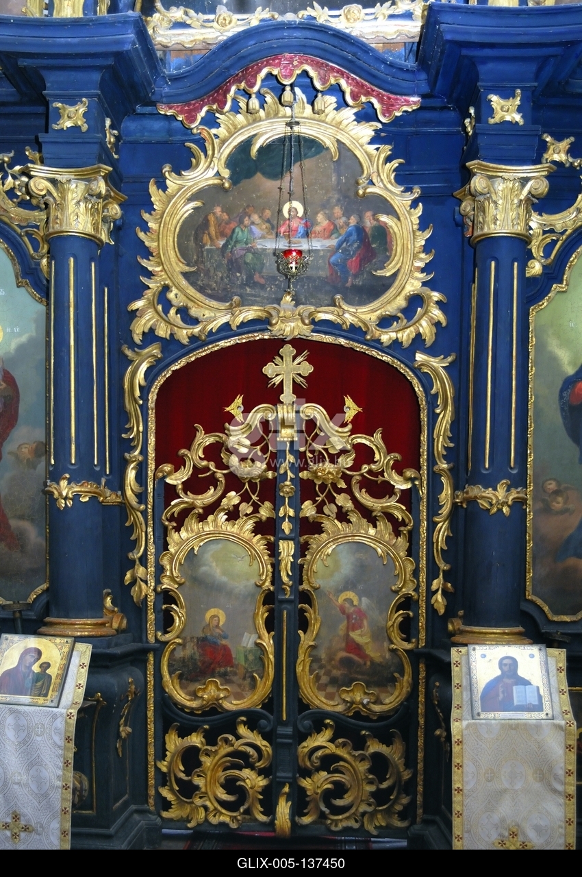 Szentendre, a Gyümölcsoltó Boldogasszony (Blagovesztenszka) templom ikonosztáza. Feltételezések szerint az épületet Mayerhoffer András (1690-1771) tervezte. A templomot 1754. október 15-én Dioniszilje Novákovics budai püspök szentelte fel. A templom védőszentje Gyümölcsoltó Boldogasszony. A Fő tér keleti oldalán emelkedő, kelet-nyugat tengelyű templom barokk és rokokó stílusban épült.