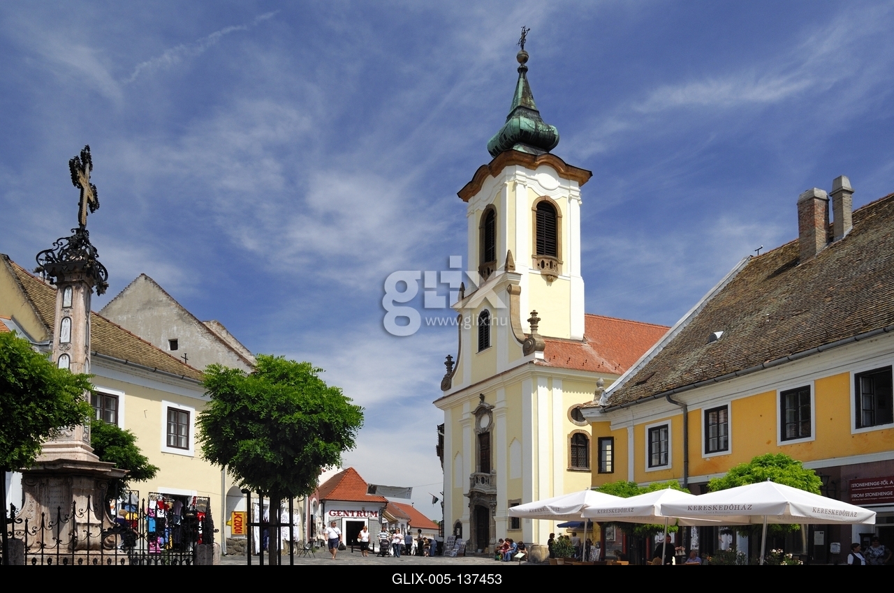 Szentendre, a Fő tér a Kalmár-kereszttel és a Gyümölcsoltó Boldogasszony (Blagovesztenszka) templommal. A Fő tér színpompás barokk, rokokó és copf stílusú házai megőrizték a régi kereskedőházak arányát. Építtetőik, a török elől Szentendrére menekült szerb és görög kereskedők, magukkal hozták mediterrán világukat, melynek hangulatát beleépítettek a házak köveibe.