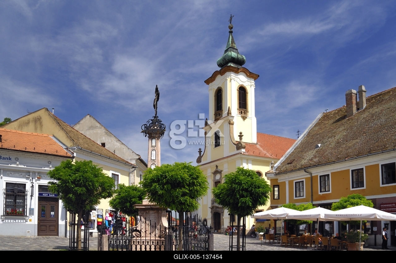 Szentendre, a Fő tér a Kalmár-kereszttel és a Gyümölcsoltó Boldogasszony (Blagovesztenszka) templommal. A Fő tér színpompás barokk, rokokó és copf stílusú házai megőrizték a régi kereskedőházak arányát. Építtetőik, a török elől Szentendrére menekült szerb és görög kereskedők, magukkal hozták mediterrán világukat, melynek hangulatát beleépítettek a házak köveibe.