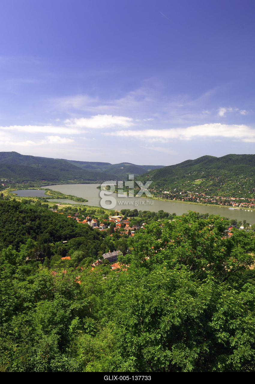 Visegrád, a Dunakanyar látképe a Fellegvárból, a Visegrádi-hegységgel és a Börzsönnyel.